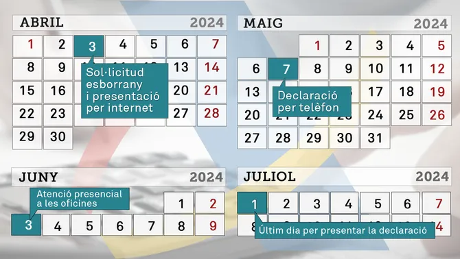 A partir del dia 1 d'abril fins a l'1 de juliol és el període establert per l'Agència Tributària espanyola per resoldre l'obligada vinculació econòmica dels particulars amb l'erari públic, ja sigui amb un resultat econòmic de retorn, perquè durant l'exercici 2023 es va contribuir en excés a les arques públiques, o bé d'ingrés, perquè l'activitat econòmica personal no va tributar suficientment i, doncs, cal ajustar aquesta quantitat en un o dos pagaments, segons la tria que pot efectuar cadascú.